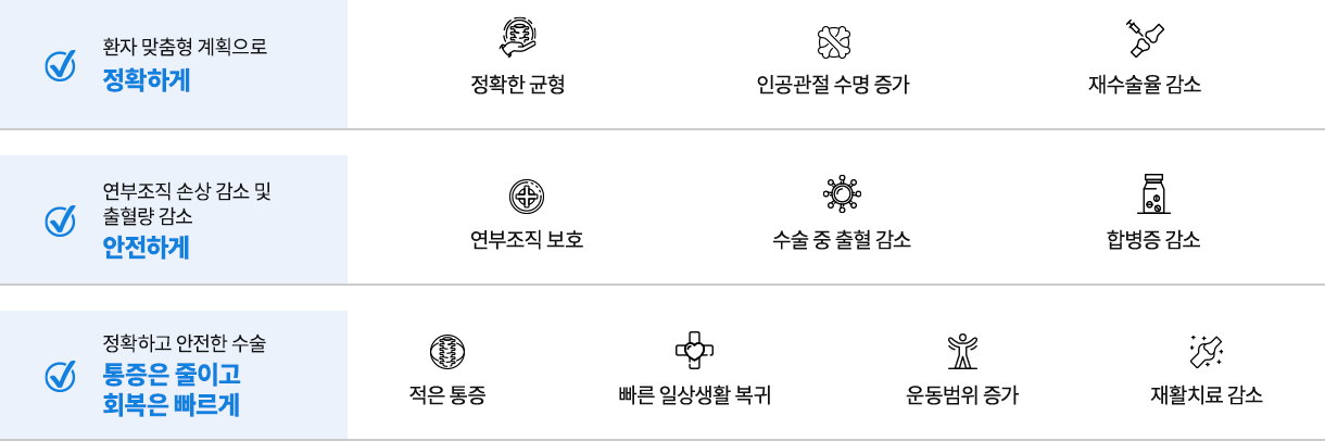 로봇을 이용해 뼈를 정밀하게 절삭하기 때문에 기존 수기로 절삭하던 방식보다 오차없이 정확하게 인공관절을 삽입해 수술 성공률을 높혔습니다.